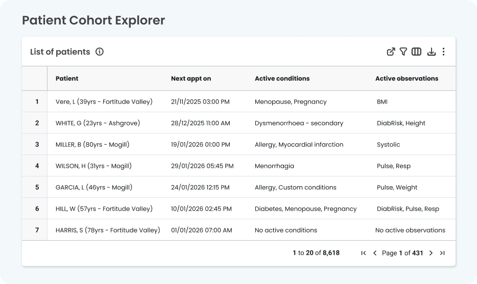 Give your team instant visibility into specific patient cohorts. Cubiko helps you quickly segment your population by age, observations, risk,or demographic. Build targeted lists in seconds so clinicians, nurses and care coordinators can spend more time delivering care and less time hunting for data.